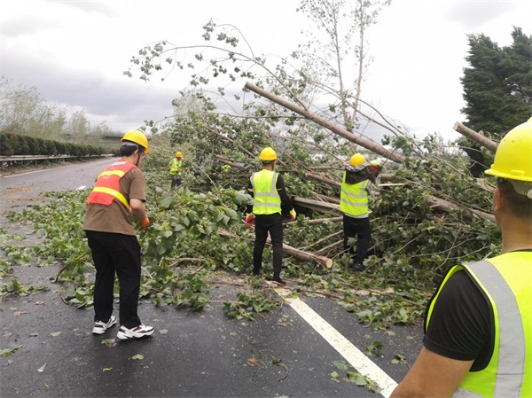 20日中午12時,寧連高速公路南京方向K1716處受龍卷風(fēng)影響,造成路面兩側(cè)樹木倒伏120余棵,倒伏樹木阻斷了雙向交通,使交通受到影響。公司迅速啟動應(yīng)急搶險快速反應(yīng)機(jī)制,搶險人員爭分奪秒利用油鋸對倒伏路樹分段鋸斷,對倒伏樹木進(jìn)行快速處理,經(jīng)過20分鐘的戰(zhàn)斗,先打通一條車道讓過往車輛先通行,后經(jīng)過3個小時的緊張工作,將路面上的倒伏樹木全部清理完成,及時地消除了道路安全隱患,保障了道路行車安全。
