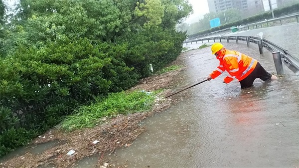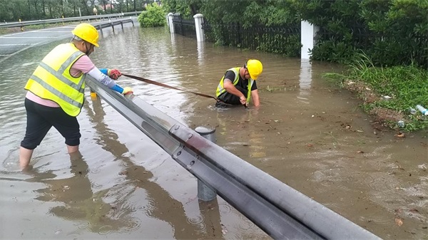 2023年7月11日上午,連云港地區(qū)突降暴雨,為保障行車安全,項目部積極開展巡查工作,增強排澇力度,確保道路通暢。