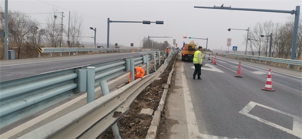 1月16日,S242燒香河大橋K75+800下行發(fā)生交通運輸事故,造成中分帶兩側(cè)近40米護欄損壞,存在安全隱患,豐達公司應(yīng)急搶修人員第一時間趕赴現(xiàn)場,不畏嚴寒迅速開展維修工作,拆除損壞護欄、安裝立柱、更換護欄,及時完成護欄維修任務(wù),確保了管養(yǎng)道路設(shè)施的完好、齊全及道路的安全暢通。