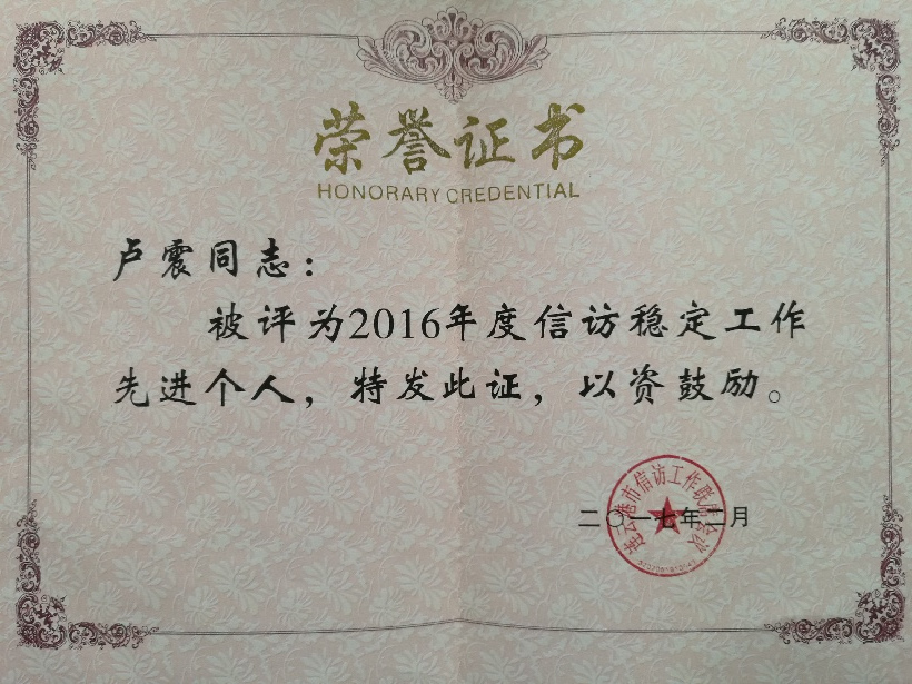 盧震同志平時認真履行工作職責,扎實有效地做好信訪穩(wěn)定工作,為促進企業(yè)和諧穩(wěn)定發(fā)展作出了貢獻。