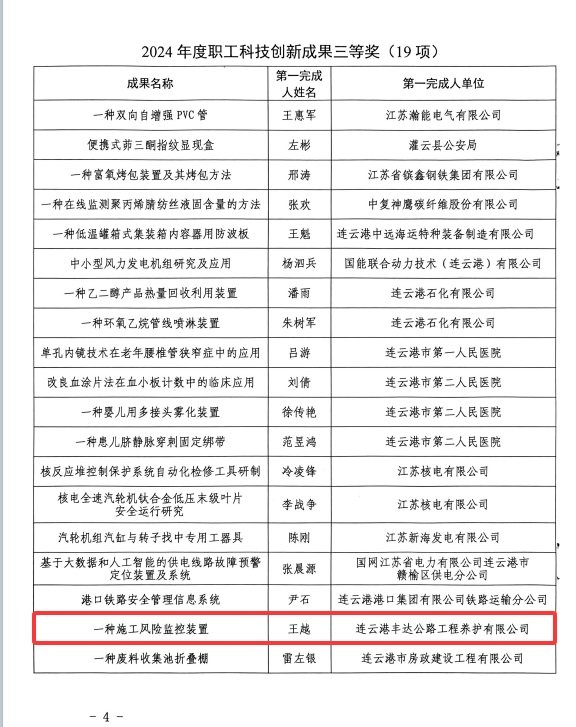 為全面落實習近平總書記關(guān)于科技創(chuàng)新的重要指示要求,連云港市總工會緊扣《新時代連云港產(chǎn)業(yè)工人隊伍建設(shè)改革實施方案》,在全市職工中征集科技創(chuàng)新成果和先進操作法。經(jīng)個人申報、單位推薦、專家評審、媒體公示,認定和表彰33項操作法為“2024年度連云港市職工科技創(chuàng)新成果。公司職工王越的“一種施工風險監(jiān)控裝置”獲市職工科技創(chuàng)新成果三等獎。