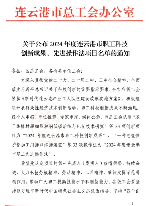 近日,在2024年度連云港市職工科技創(chuàng)新成果、先進操作法作品評選中,豐達公司王越一項創(chuàng)新成果獲市職工科技創(chuàng)新成果三等獎。