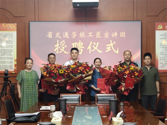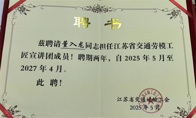 近日,江蘇省交通勞模工匠宣講團授聘儀式在市交通運輸局隆重舉行。公司勞模工匠董入龍榮獲授聘書,成為宣講團的新成員。