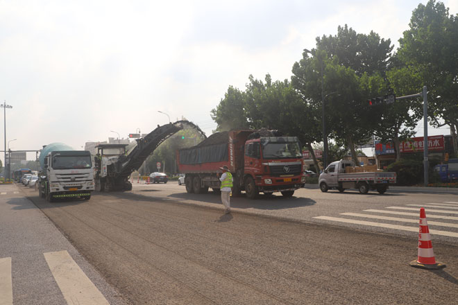 人民路外圍車流量大,重型車輛較多,路面沉降、龜裂、車轍等病害較為嚴重,行車舒適性較差,且不能全封閉施工。為加快施工進度,避免高峰路段擁堵,項目部人員不畏高溫酷暑,攻堅克難,采取降塵除塵、分段施工、基坑防護等多項措施錯峰施工,克服噪音擾民等諸多困難,做好全線文明施工工作,共投入機械設(shè)備18余臺次,人員30余人,歷經(jīng)八晝夜的加緊施工,共修補攤鋪路面56336.7平方米。